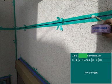 養生テープは張り終り、プライマー塗布してシーリング充填していきます!!